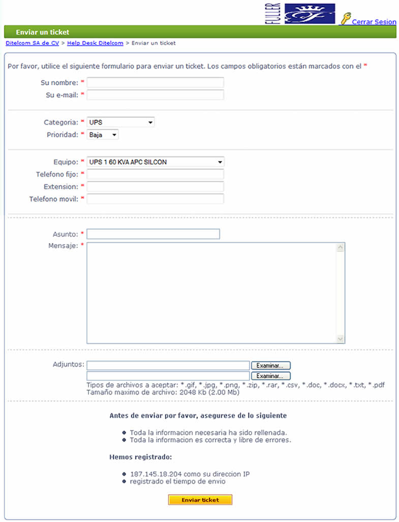 3.- Dar clic en “ENVIAR UN TICKET” y llenar el siguiente formulario: